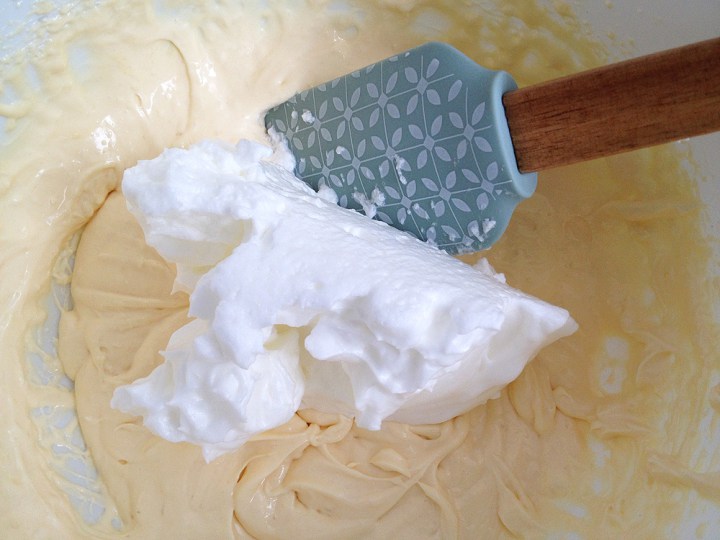 3. Bata a clara de ovo até que atinja picos leves (não precisa bater muito não) só para criar volume e ficar branquinha, ok? Misture os ingredientes secos que estavam separados com os ingredientes líquidos. Incorpore a clara de ovo batido e deixe descansar na geladeira por pelo menos uns 30 minutos. Minha dica aqui é fazer a massa na noite anterior, cobrir com papel filme e deixar na geladeira até a manhã seguinte quando for usar...ou seja, não precisa acordar mais cedo para preparar a massa e ainda deixa a massa com uma textura melhor.